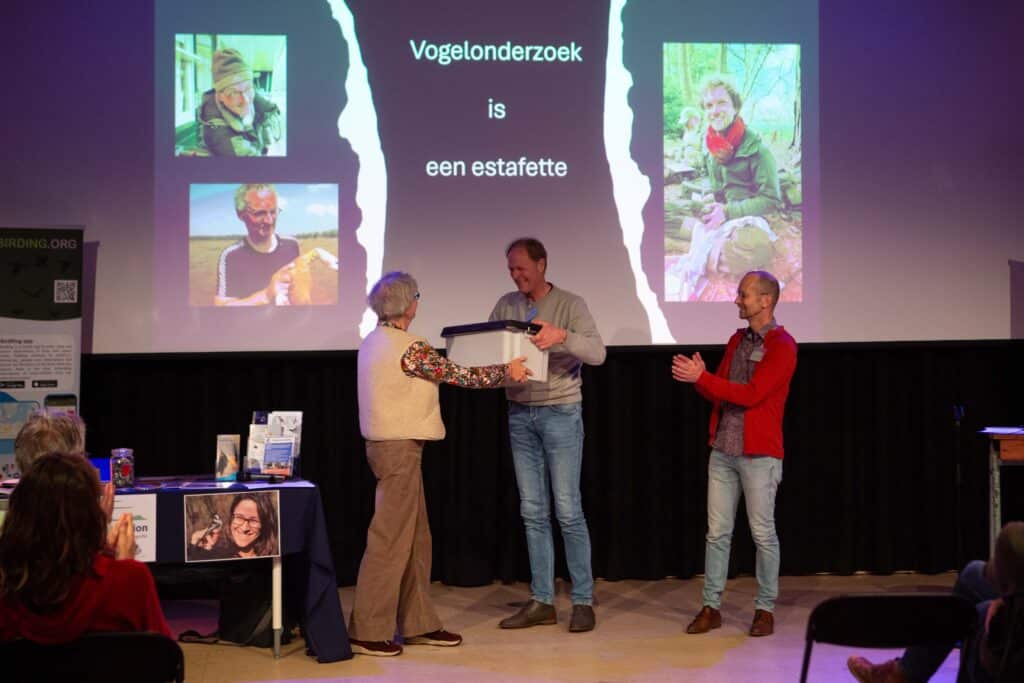 Naar aanleiding van een oproep hadden zich bij het Vogeltrekstation veel gegadigden gemeld voor de ringuitrusting van oud-voorzitter van de Ringersvereniging Sjoerd Dirksen (†). Daanjan Wisselink was de geluksvogel. Helaas moest Daanjan zich op het laatste moment afmelden voor het jubileumsymposium. Hella Smit, partner van Sjoerd, overhandigde de ringuitrusting daarom aan Daanjans’ vertegenwoordiger Peter van den Akker.