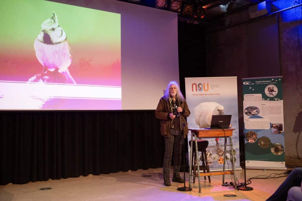 Voor een volle zaal licht NOU-voorzitter Christiaan Both toe waarom voor het dagthema terug gegrepen is op het gelijknamige boek van J.P. Thijsse: Het intieme leven van vogels. Foto: Jouke Altenburg.