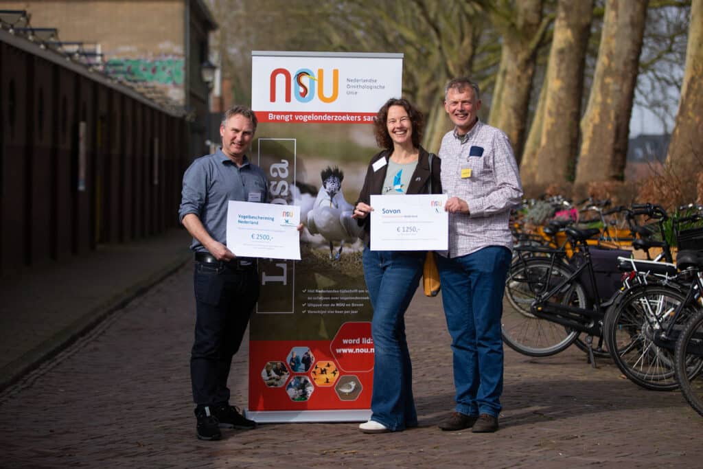 Dianne Nijland (Sovon) en Floris van Kuijk (VBN) overhandigden beiden een cheque voor het instellen van een geolocatorfonds door de NOU i.s.m. het VT. Bij elkaar het prachtige startbedrag van € 3750,- . Vrijwillige ornithologen kunnen dit fonds om een bijdrage vragen voor de aanschaf van geolocators, wanneer zij goed terug vangbare vogelsoorten willen onderzoeken, waarvan de trekroutes en/of overwinteringsgebieden slecht bekend zijn.